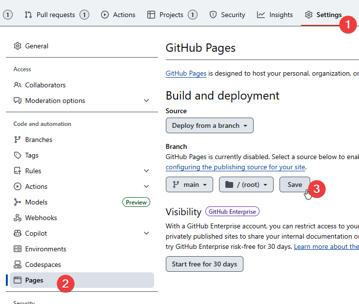 GitHub pages deployment works by making the files available on a particular branch available online. This works best if you have HTML, JavaScript and CSS files all stored in a branch that you want to host on the web. GitHub pages assumes that you will have an index.html file in the root directory of your repository.